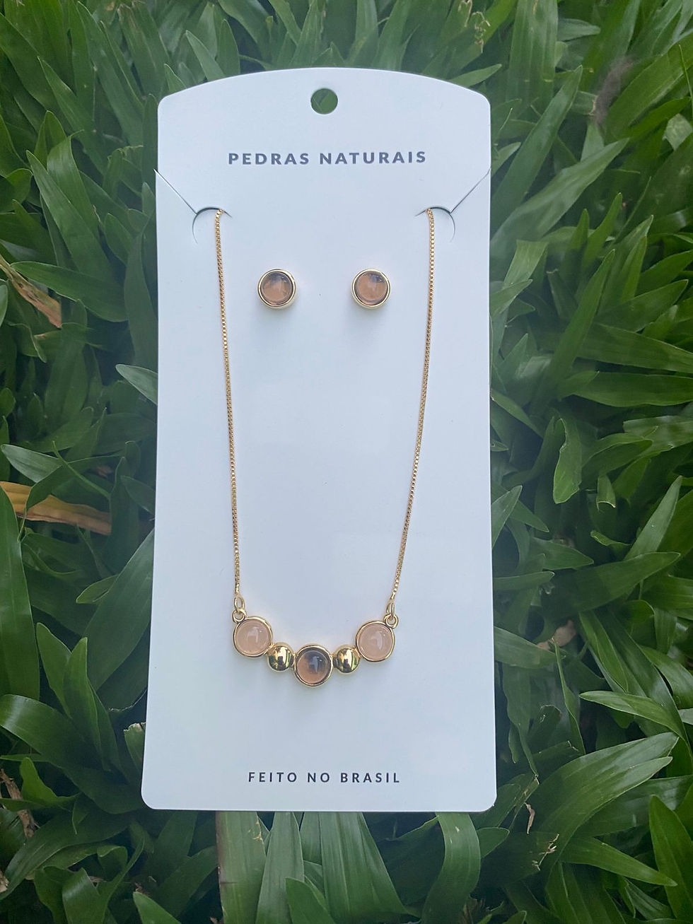 Conjunto Dourado P colar 3 pedras Quartzo Rosa e Fumê